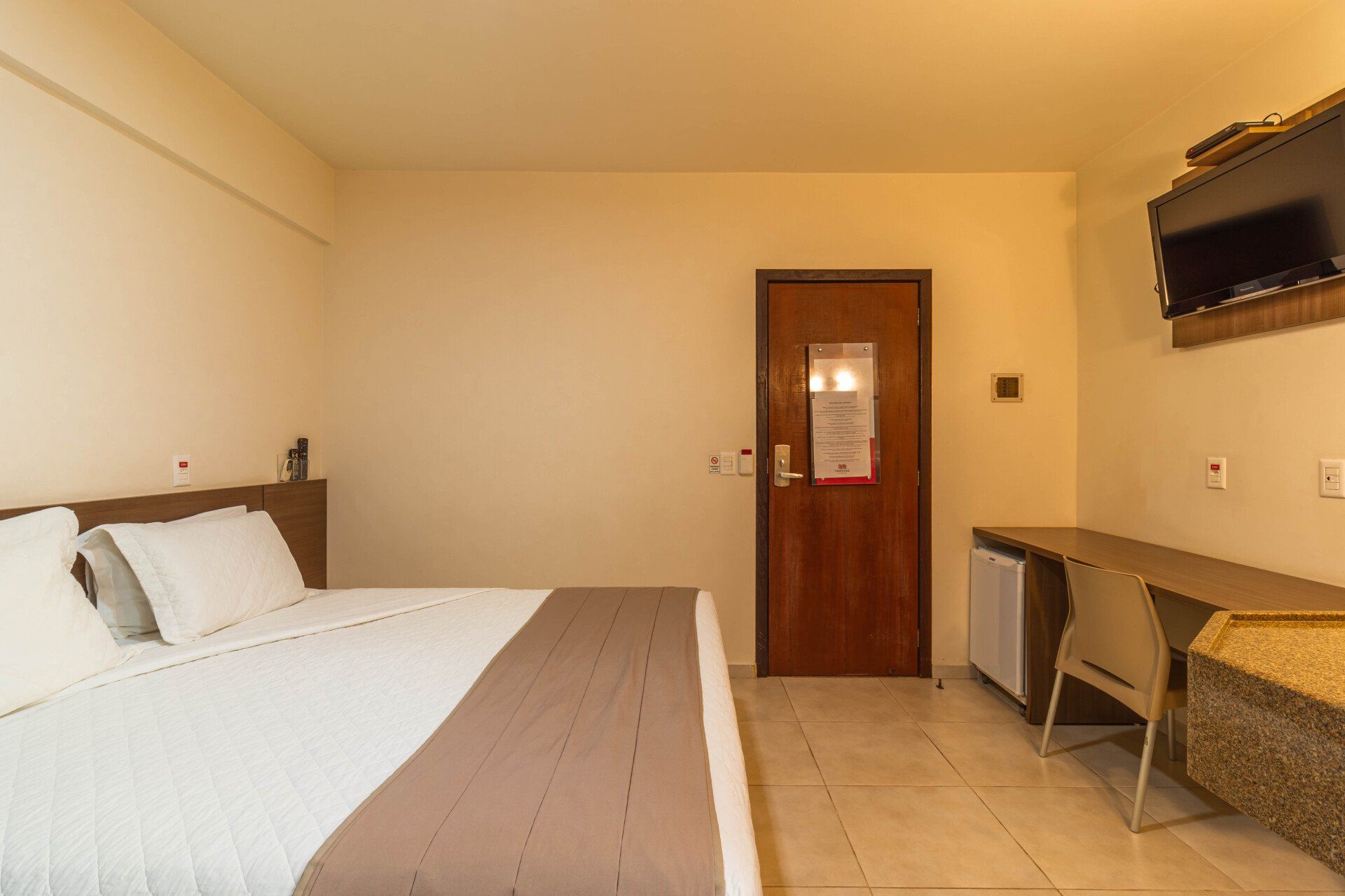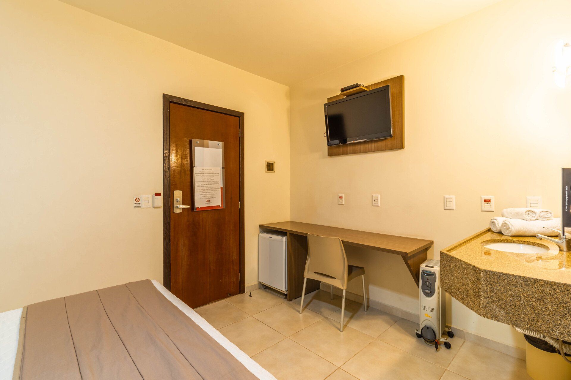18 metros quadrados, cama box, ar condicionado, aquecedor, frigobar, ducha com aquecimento central, tv a cabo, mesa de trabalho e cadeira.