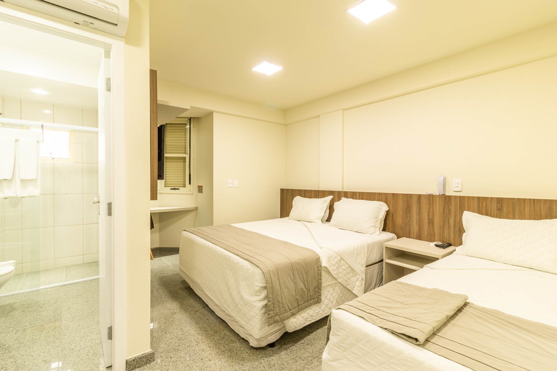 20 metros quadrados, cama box, ar condicionado, aquecedor, frigobar, ducha com aquecimento central, tv a cabo, mesa de trabalho e cadeira.